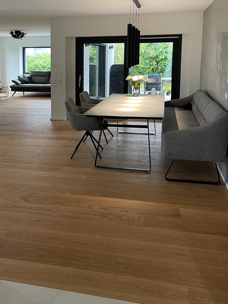 Eine ruhige Eiche in geölter und gebürsteter Variante ist zeitlos, ist passend zu den meisten Möbeln. Die weißen Sockelleisten dazu lassen die Räume offen und hell wirken.